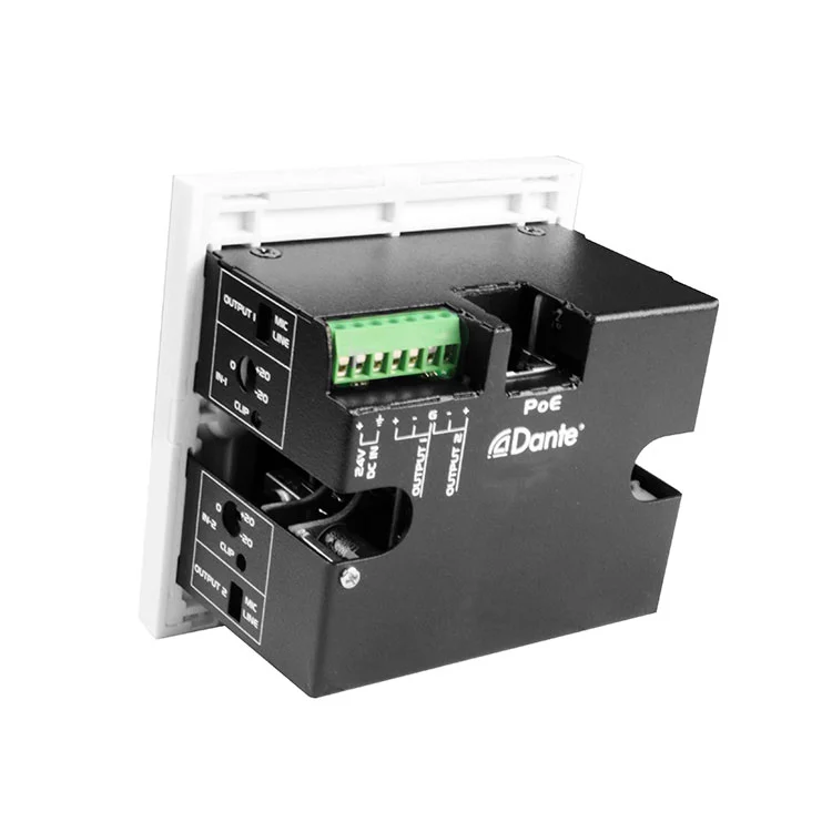 El panel de la interfaz de las salidas de 2ch Dante Interface 2 Mic/Line X 2 es perfecto para aplicaciones de audio profesionales, como salas de conferencias, configuraciones de sonido en vivo, estudios de transmisión y sistemas AV instalados, donde se requiere una conversión confiable de Dante a Analog y analógica a dante en un factor de forma compacto y sin rack. Su diseño montado en la pared permite una integración limpia y eficiente en varios entornos al tiempo que mantiene el rendimiento de audio de alta calidad.